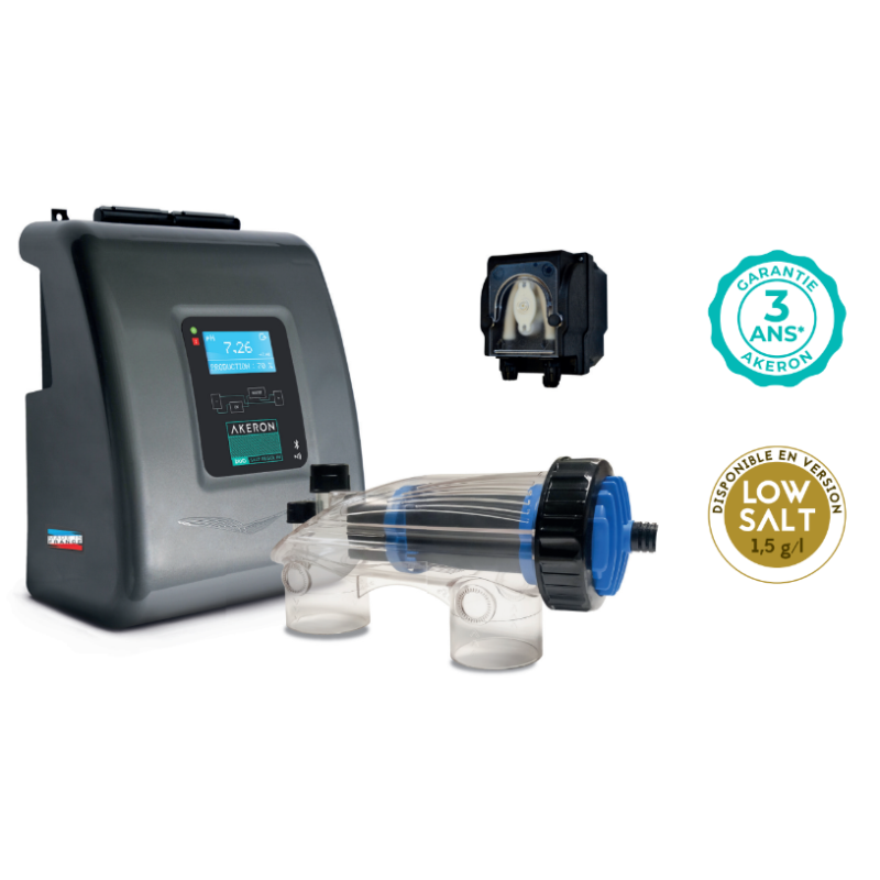 Le nouvel électrolyseur au sel Akeron Salt DUO+ assure une désinfection parfaite de l’eau en toute simplicité avec sa nouvelle connectivité qui permet le contrôle à distance. L’équilibre permanent du pH est maintenu par injection du produit correctif nécessaire via sa pompe péristaltique.